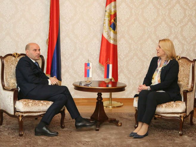 Predsjednica Republike Srpske Željka Cvijanović istakla je danas na sastanku sa ambasadorom Srbije u BiH Aleksandrom Đorđevićem da je institucionalna saradnja Srpske i Srbije na izuzetno visokom nivou, te izrazila zadovoljstvo činjenicom da se intenzivno razvijaju novi zajednički projekti, posebno oni koji se odnose na privredu.