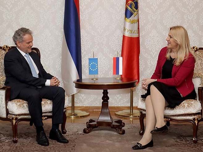 Predsjednica Republike Srpske Željka Cvijanović razgovarala je danas u svom kabinetu sa šefom Delegacije Evropske Unije u BiH i specijalnim predstavnikom EU u BiH Јohanom Satlerom.