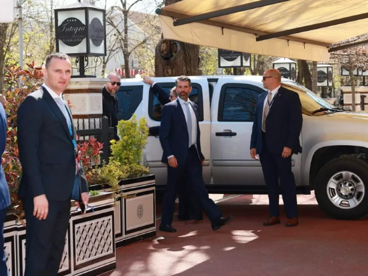 – Tramp Mlađi u Banjaluku je stigao u pratnji vjerenice Betine Anderson, američkog modela, influenserice i filantropkinje. Paru se pridružio i Bred Parskal, dugogodišnji saradnik porodice koji je, između ostalog, radio kampanje Donalda Trampa 2016. i 2020. godine.