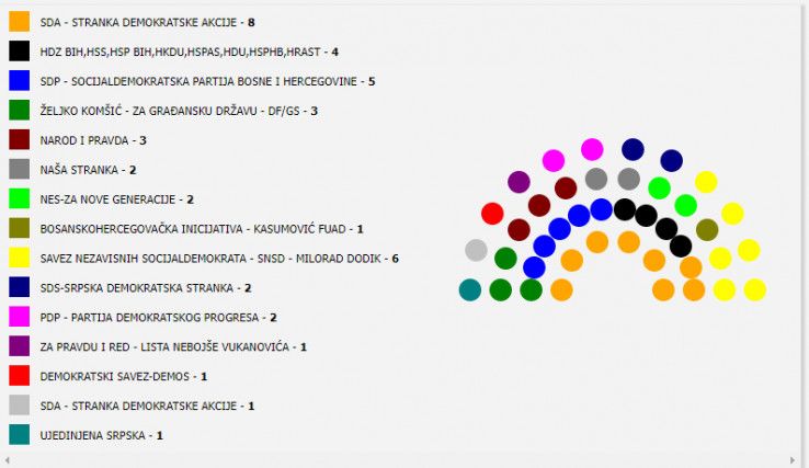 SDA će imati najviše poslanika u ovom domu, čak njih devet, a od čega će jedan biti iz RS-a, a riječ je o Edinu Ramiću. SNSD će imati šest mandata, a prati ih SDP BiH sa pet. HDZ BiH je jedina stranka koja će imati četiri mandata u ovom domu.