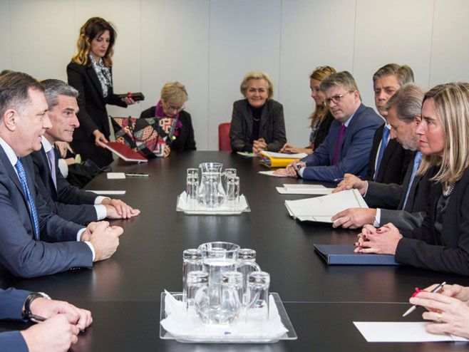 Predsjedavajući Predsjedništva BiH Milorad Dodik sastao se u Briselu sa evropskim zvaničnicima i uručio evropskom komesaru za proširenje Јohanesu Hanu odgovore na dodatna pitanja iz Upitnika Evropske komisije.
