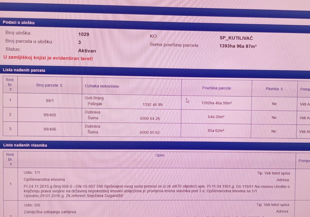 “Investitor je dakle tražio, sve po osnovu ugovora o koncesiji, a organi federalne i kantonalne vlasti su izdržavali različite dozvole, iako se cjelokupni planirani kamenolom nalazi na državnom zemljištu. Naime, uvidom u zemljišnoknjižni izvadak za ZK uložak 1029 k.o. SP_Kutilivač kojim naše udruženje raspolaže (po stanju na portalu e-grunt do danas nije bilo izmjena na parceli), na k.č. 99/1 ukupne površine od 1.390 hektara kao vlasnik upisana je OPŠTENARODNA IMOVINA s dijelom od 1/1 još od 1951. godine”, navodi se u prijavu.