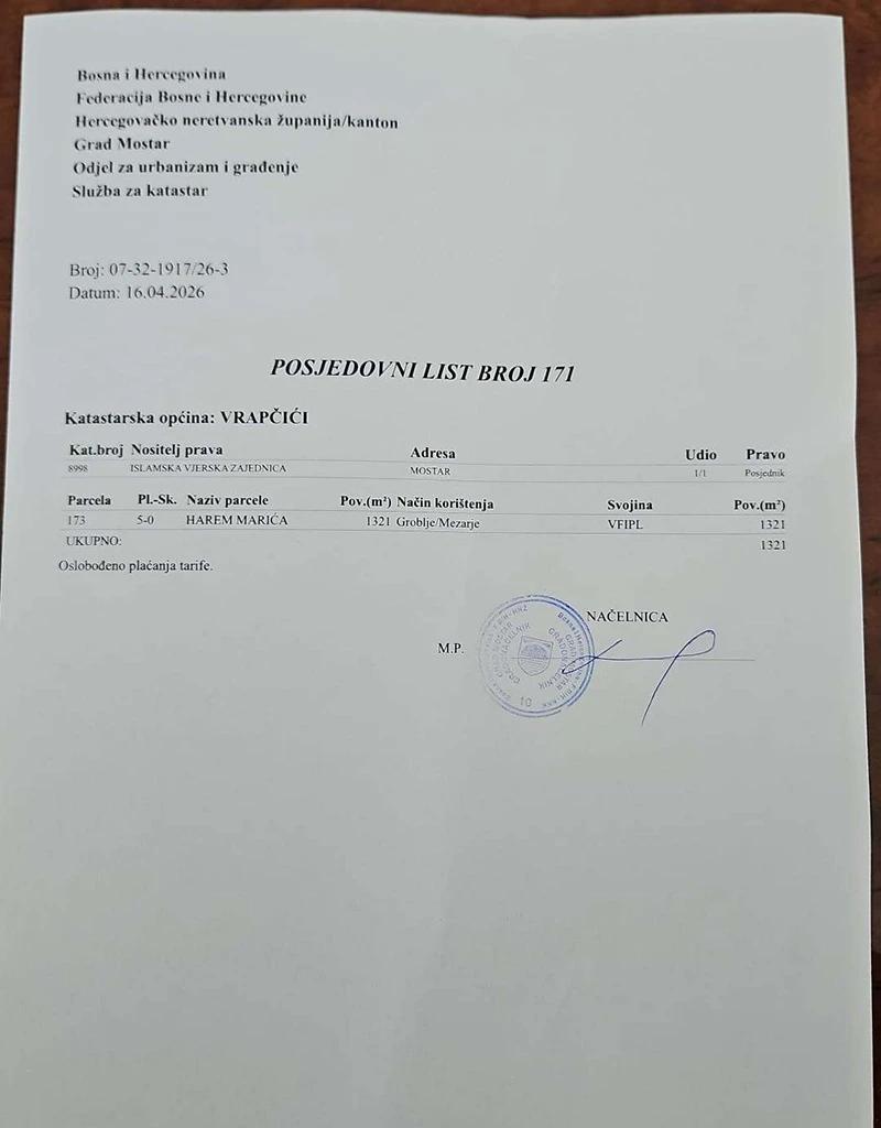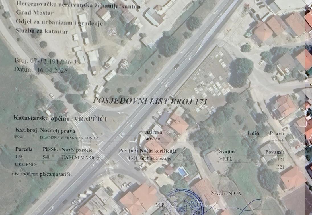 ‘Shodno tome, Grad Mostar je dužan izvijestiti javnost da njegova Služba za katastar nije vršila promjenu posjednika niti bilo kakvu drugu promjenu na parceli označenoj kao k.č. 173 KO Vrapčići (Harem Marića), upisanoj u posjedovni list 171. Na toj parceli kao posjednik se vodi Islamska vjerska zajednica, s navedenim načinom korištenja groblje/mezarje”, naveli su u reagovanju uz koje su priložili posjedovni list.