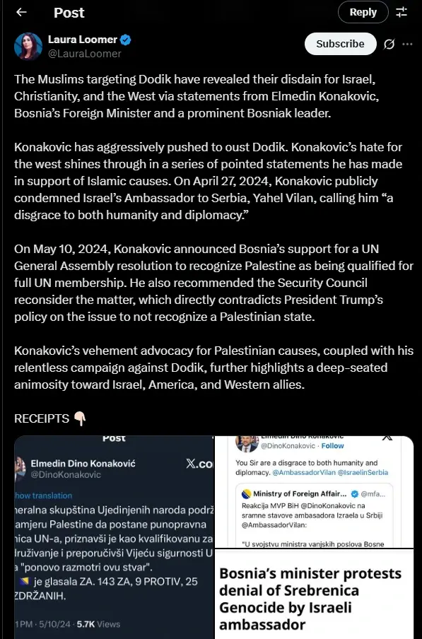 “Muslimani koji ciljaju Dodika otvoreno su pokazali prezir prema Izraelu, hrišćanstvu i Zapadu kroz izjave Elmedina Konakovića, ministra spoljnih poslova BiH i istaknutog bošnjačkog lidera”, napisala je Lumer u svojoj objavi i nastavila kritiku.