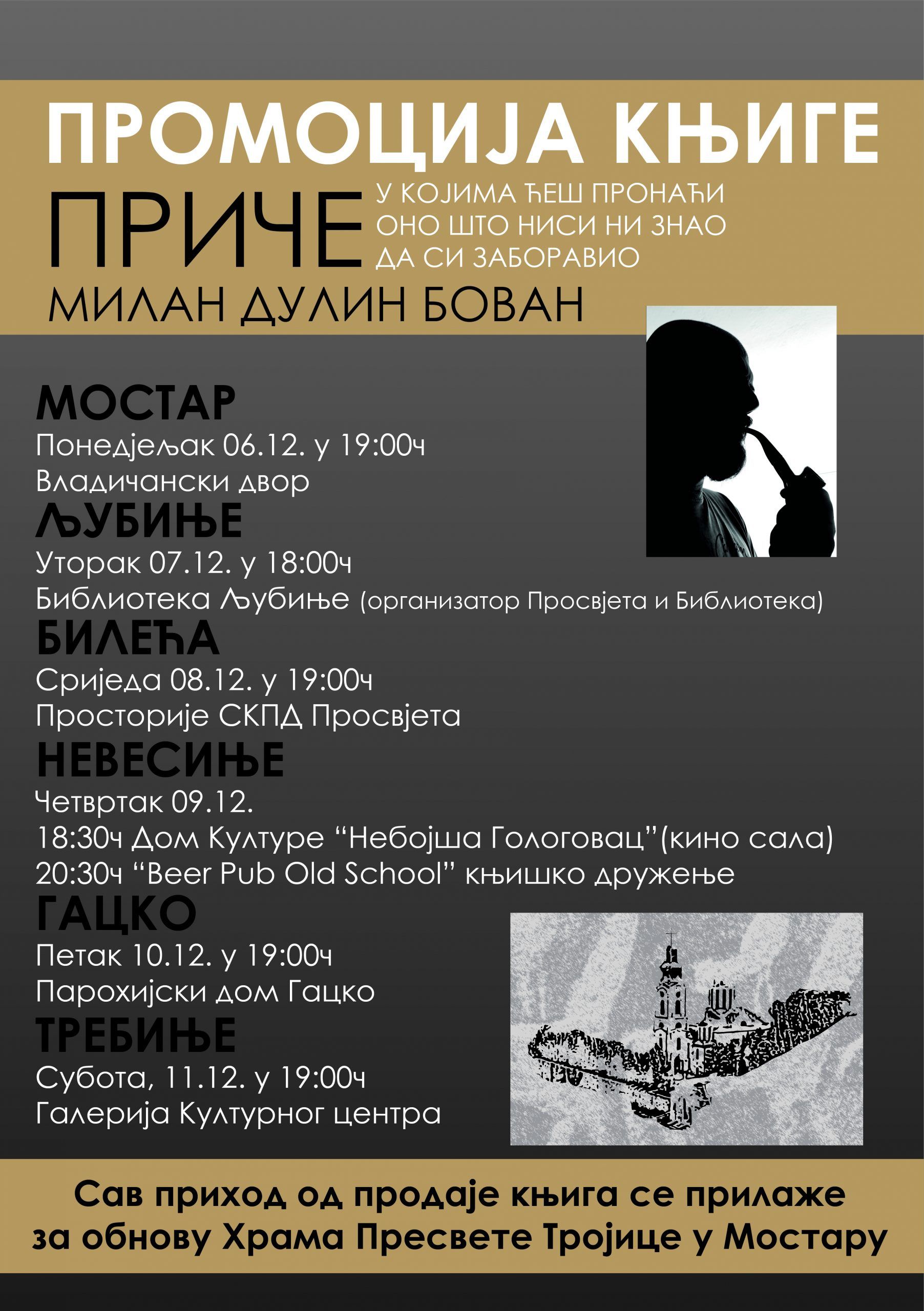 Prva knjiga Milana Bovana ”Priče u kojima ćeš pronaći ono što nisi ni znao da si zaboravio” ovih dana izašla je iz štampe, a već od ponedjeljka kreće promocija u cijeloj Hercegovini. Ovaj Mostarac sa podgoričkom adresom prihod od prodaje cjelokupnog tiraža doniraće za obnovu Saborne crkve Svete Trojice u Mostaru. Prva promocija knjige biće održana u Mostaru, u ponedjeljak 6. decembra u 19 časova u Vladičanskom dvoru. Slijedi Ljubinje, Bileća, Nevesinje, Gacko i Trebinje. U korice knjige Milana Bovana smjestile su se neke davno ispričane i možda već zaboravljene priče iz hercegovačkih krajeva, ali i i neke druge iz piščeve mašte. Kako je knjiga nastala i šta nam donosi pitali smo Bovana.