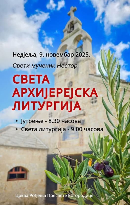MITROPOLIT DIMITRIJE U NEDJELJU SLUŽI U MOSTARU 08.11.2025 18:53 Mitropolit zahumsko-hercegovački i stonsko-primorski Dimitrije služiće svetu u nedjelju arhijerejsku liturgiju u crkvi Rođenja Presvete Bogorodice u Mostaru. Jutrenje počinje u 8.30, a sveta liturgija u 9.00 časova.