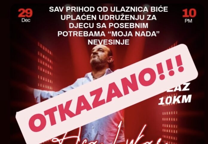 Koncert folk pjevača Ace Lukasa, koji je bio zakazan za 29. decembar u noćnom klubu “Jedno mjesto” u Nevesinju, otkazan je, objavljeno je na zvaničnoj Instagram stranici ovog kluba.