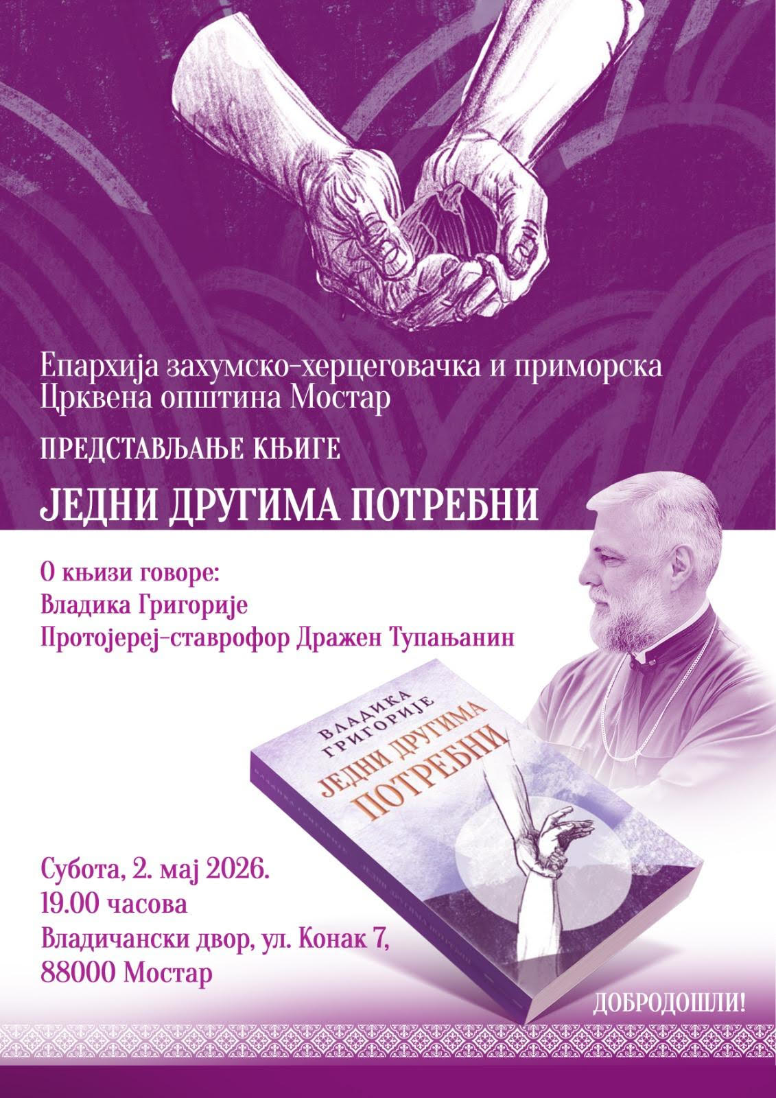 Njegovo visokopreosveštenstvo mitropolit njemački Grigorije predstaviće svoju novu knjigu „Jedni drugima potrebni“ u subotu, 2. maja u Vladičanskom dvoru u Mostaru (Konak 7).