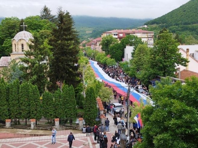 Srbi u Zvečanu okupljeni ispred opštine, razvili su jutros srpsku zastavu dugu čak 250 metara.
