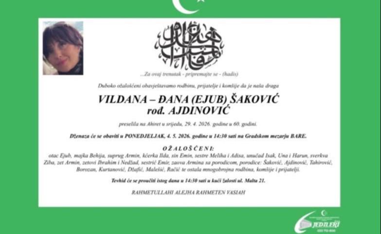 Regionalnu javnost i muzičku scenu duboko je potresla vijest da je Vildana Đana Šaković, supruga poznatog muzičara i autora Armina Šakovića, preminula 29. aprila u 60. godini života.