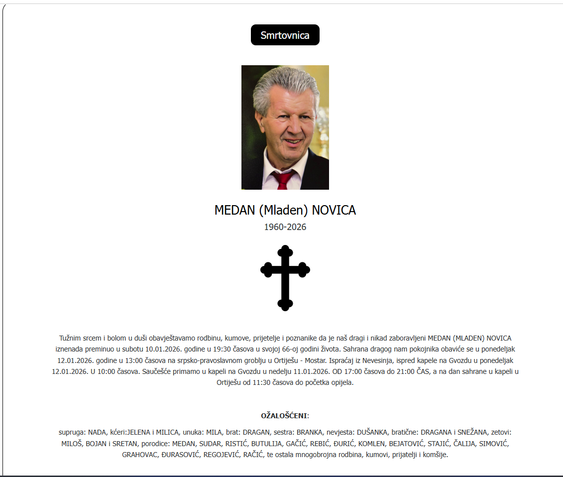 Novica Medan, Odbornik Socijalističke partije Srpske u Skupštini opštine Nevesinje i oficir Vojske RS, sinoć je iznenada preminuo u 66. godini.