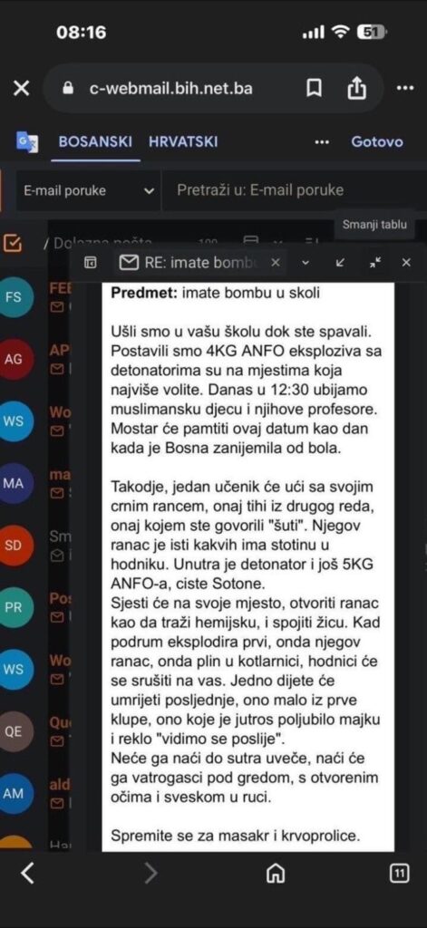 Prijeteći mail koji je poslan školama u Hercegovačko-neretvanskom kantonu ledi krv u žilama. Kako je ranije potvrđeno iz MUP-a HNK, dojave o bombama zaprimljene su u više obrazovnih ustanova, među kojima su škole u Mostaru, Čapljini, Konjicu, Jablanici, Stocu i Neumu, nakon čega su učenici evakuisani, a policija započela protiveksplozivne preglede.