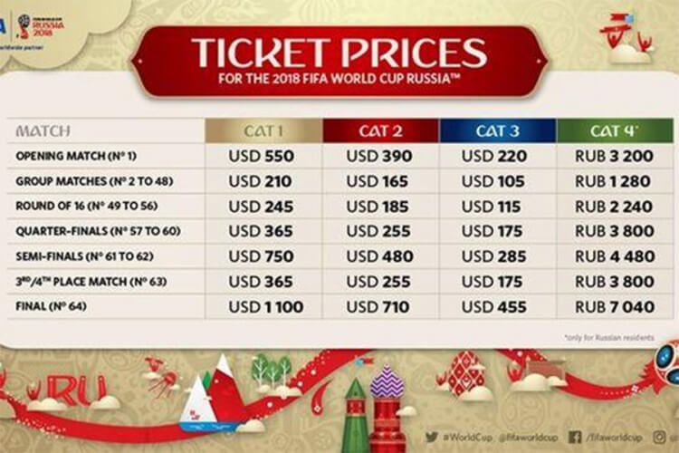 Najjeftinija karta za duele grupne faze iznosi 105 dolara, dok je najskuplja 210. Istovremeno, karte takozvane četvrte kategorije mogu da kupe samo državljani Rusije po simboličnoj ceni od dvadesetak evra.