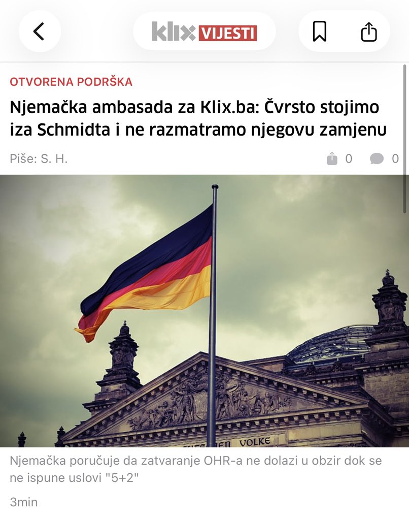 Podsjećamo, Njemačka ambasada u BiH je danas za portal Kliks izjavila da stoji iza Kristijana Šmita i OHR.