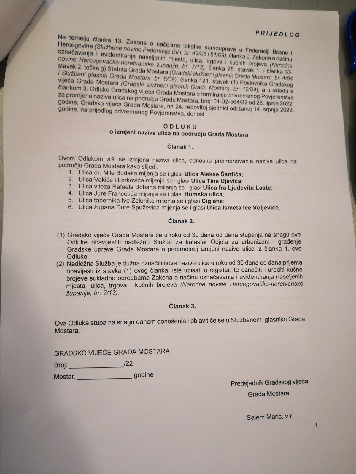 Naime, gradonačelnik će predložiti izmjenu naziva šest ulica koje su nosile imena po ustaškim zločincima, a čije izmjene je usaglasila Komisija koju je formiralo Gradsko vijeće Mostara.