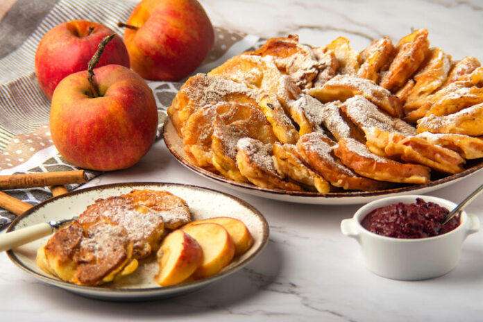 Oljuštite jabuke, izdubite sredinu i isjecite na tanke kriške. Pomiješati preostale sastojke osim ulja i šećera u prahu, smjesa mora biti gušća od smjese za palačinke. Po potrebi dodajte još brašna. U smjesu stavite kriške jabuke, a zatim u zagrijano ulje i pržite sa obje strane dok ne porumene. Stavite na salvetu da upije višak masnoće. Posuti šećerom u prahu. Prijatno!