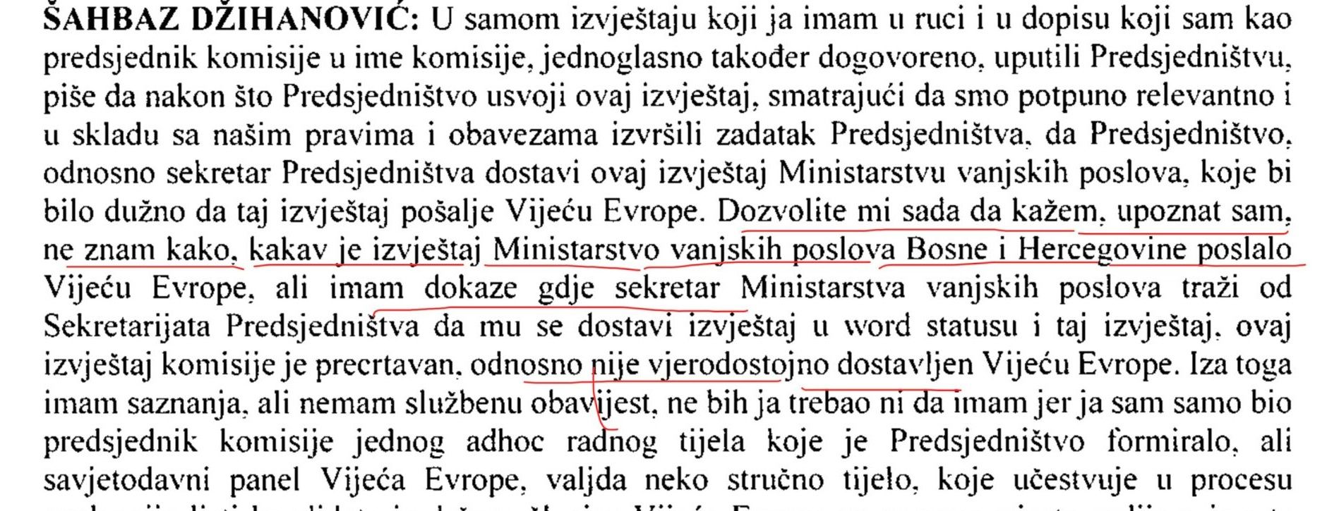 – Dozvolite mi da kažem – upoznat sam, ne znam kako, kakav je izvještaj Ministarstvo vanjskih poslova Bosne i Hercegovine poslalo Vijeću Evrope, ali imam dokaze gdje sekretar Ministarstva vanjskih poslova traži od Sekretarijata Predsjedništva da mu se dostavi izvještaj u word statusu i taj izvještaj, ovaj izvještaj komisije je precrtavan, odnosno nije vjerodostojno dostavljen Vijeću Evrope – rekao je Džihanović na sjednici Predsjedništva BiH, održanoj 1. aprila.