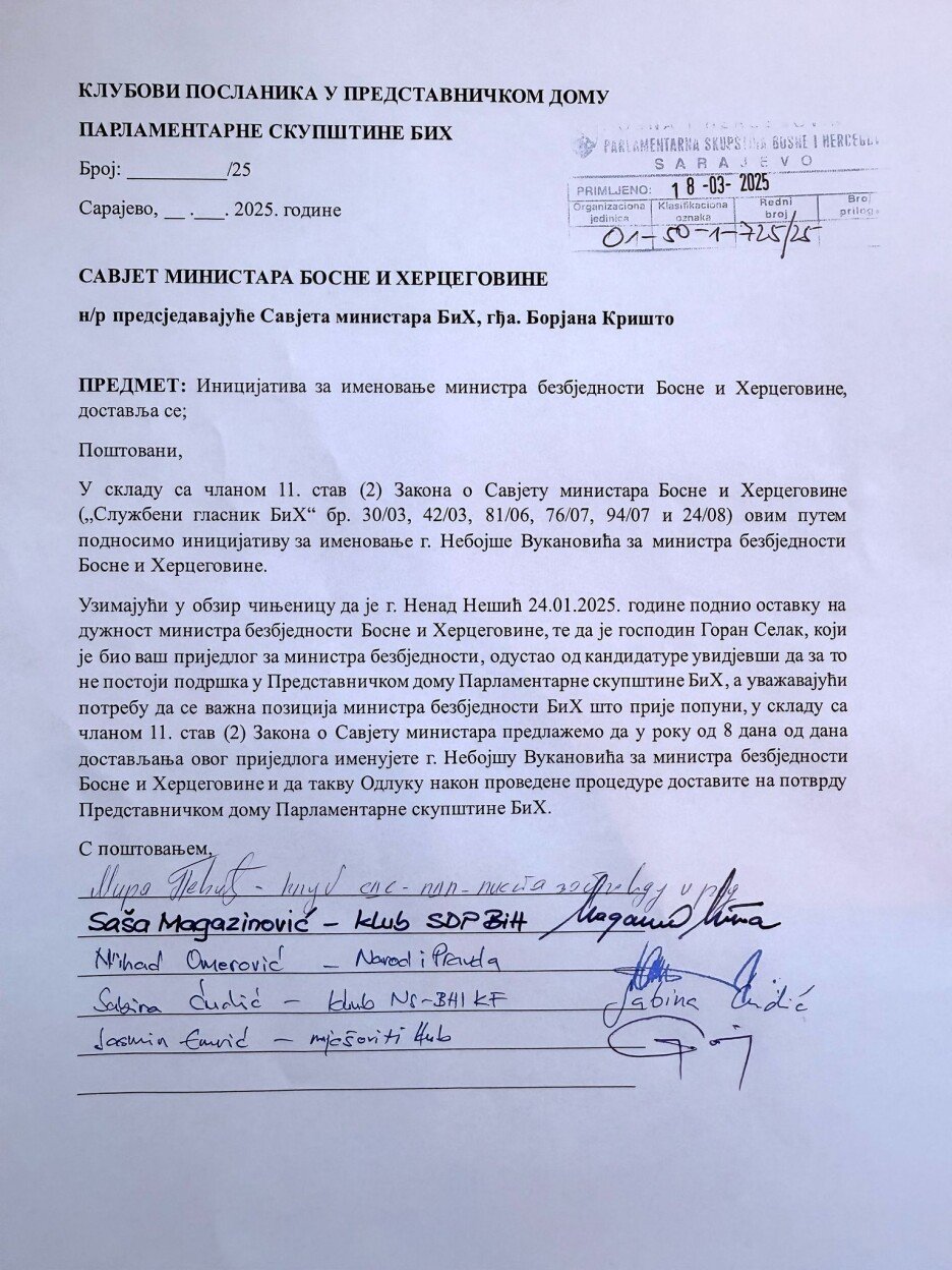 Ovom inicijativom, poslanici od predsjedavajuće Krišto traže da u roku od osam dana zvanično predloži Vukanovića za ministra.