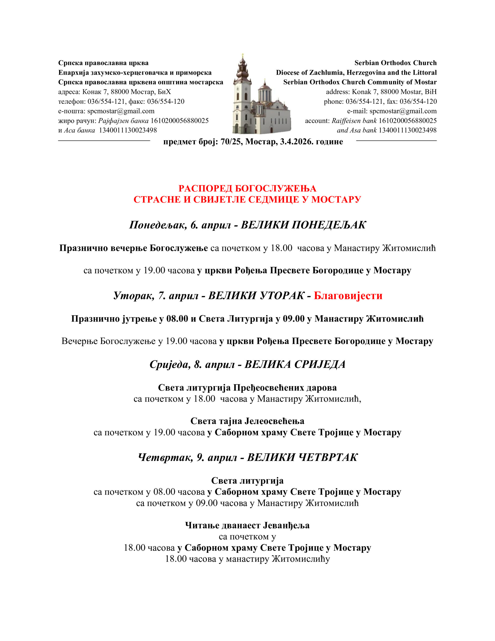 U nastavku donosimo detaljan raspored bogosluženja: