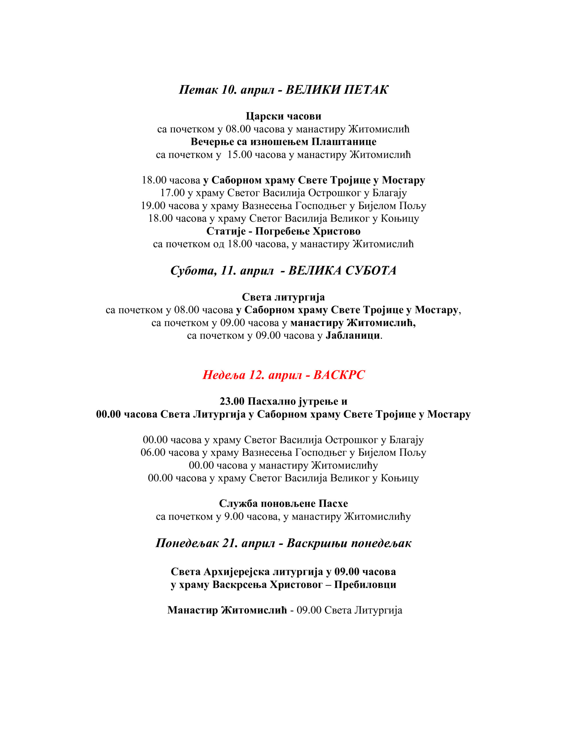 Povodom najvećeg hrišćanskog praznika – Vaskrsa, u pravoslavnim hramovima na području Mostara, Konjica, Jablanice i Čapljine biće služena bogosluženja tokom Velike sedmice i vaskršnjih dana. Vjernici će imati priliku da prisustvuju molitvenim sabranjima u Sabornom hramu Svete Trojice, Manastiru Žitomislić, Hramu Svetog Vasilija Ostroškog u Blagaju, Hramu Vaznesenja Gospodnjeg u Bijelom Polju, Hramu Svetog Vasilija Velikog u Konjicu, kao i u Hramu Vaskrsenja Hristovog u Prebilovcima.
