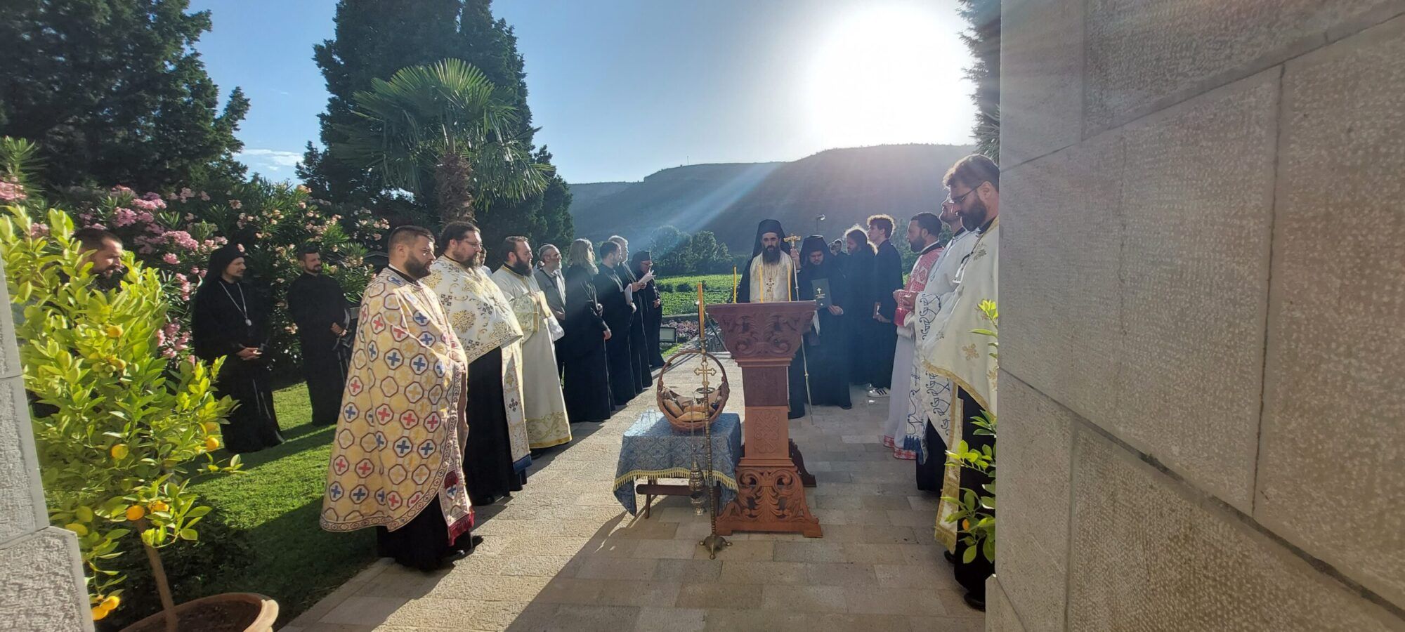 Večernjim je načastvovao vladika niški Arsenije uz sasluženje vladike zahumsko-hercegovačkog Dimitrija, arhimandrida Nektarija koji je glavni sekretar Svetog arhijerejskog Sinoda te domaćih sveštenika iz eparhije zahumsko-hercegovačke i primorske. Na večernjem je pjevao i hor Mojsije Petrovi iz Beograd koji će sutra pjevati na bogosluženju i Akademiji.