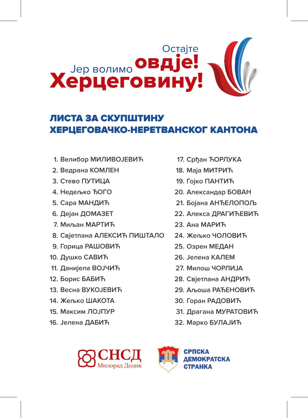 Lista ”Ostajete ovdje”, kao koaliciona lista SNSD-a i SDS-a je zahvaljujući svojim stavovima i dosljednosti podržana na prošlim lokalnim izborima i kao rezultat imamo vijećnike i odbornike u Mostaru, Stocu i Ravnom. Rezultat tih uspjeha se polako počinje osjećati i u životima građana. Srpski narod je, nakon 27 godina, postao konstitutivan u Hercegovačko-neretvanskom kantonu. Mijenjaju se sporni nazivi ulica, prisutniji smo u budžetu i zapošljavanju u gradskim institucijama. Ne samo da se naš glas čuje nego smo se počeli uvažavati kao ozbiljni politički partneri. Sada je vrijeme da idemo dalje, napravimo iskorak u političkom smislu na nivou Hercegovačko-neretvanskog kantona. Radićemo na tome da konstitutivnost, pravo na jezik i pismo zaživi i u praksi u punom svom obimu. Moramo biti prisutni u kantonalnim i entitetskim institucijama, jer glas o zahtjevima, potrebama i problemima srpske zajednice može se jedino čuti od izabranih sa ove liste.