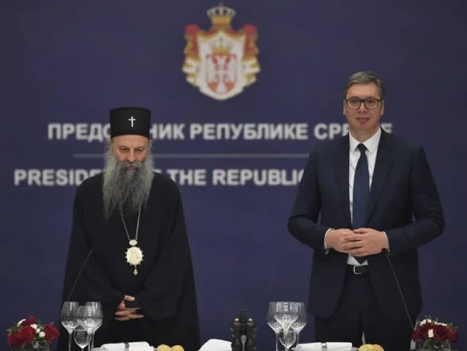 Predsjednik Srbije Aleksandar Vučić ugostio je danas Njegovu svetost patrijarha srpskog Porfirija i članove Svetog arhijerejskog Sabora Srpske pravoslavne crkve sa kojima je razgovarao o svim pitanjima od sudbinskog značaja za srpski narod i zemlju, posebno o Kosmetu.