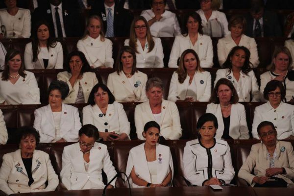 Sjedeći u Trumpovoj pozadini, predsjedavajuća Predstavničkog doma, Nancy Pelosi, nosila je bijelo odijelo i košulju, dok je ispred predsjednika sjedila grupa zastupnica – također u bijelom.